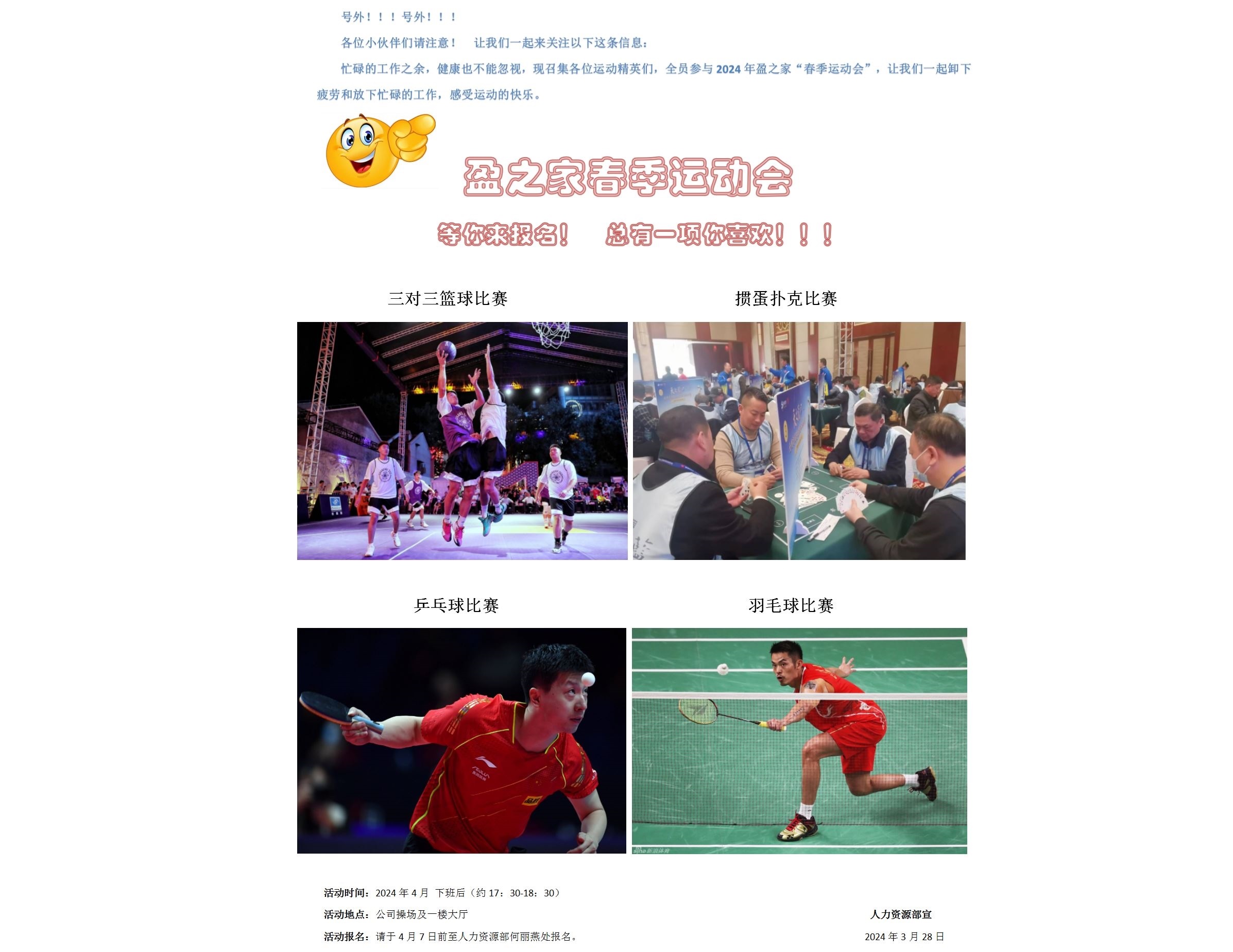 忙碌的工作之余,健康也不能忽視,現召集各位運動精英們,全員參與 2024 年盈之家“春季運動會”,讓我們一起卸下疲勞和放下忙碌的工作,感受運動的快樂。